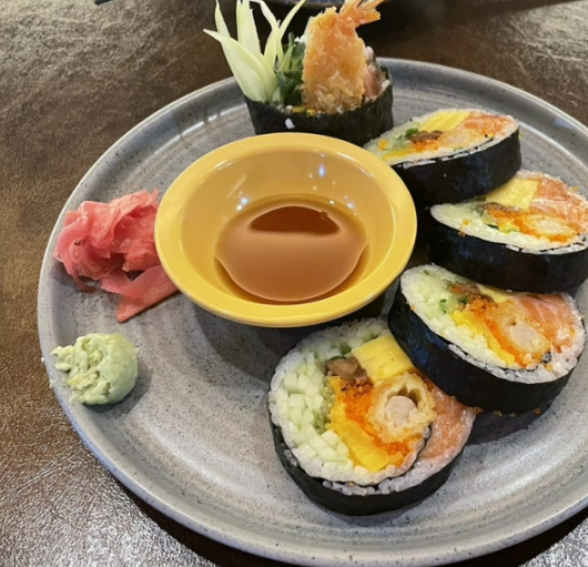 두툼한 연어가 듬뿍 올라간 김밥 스타일인데요,